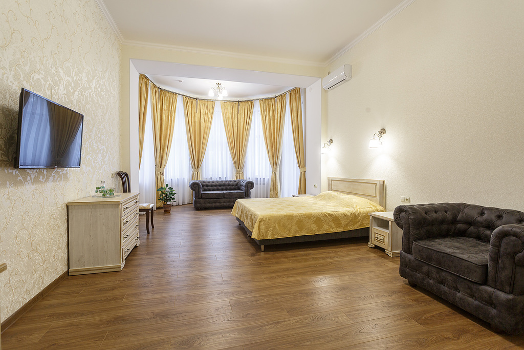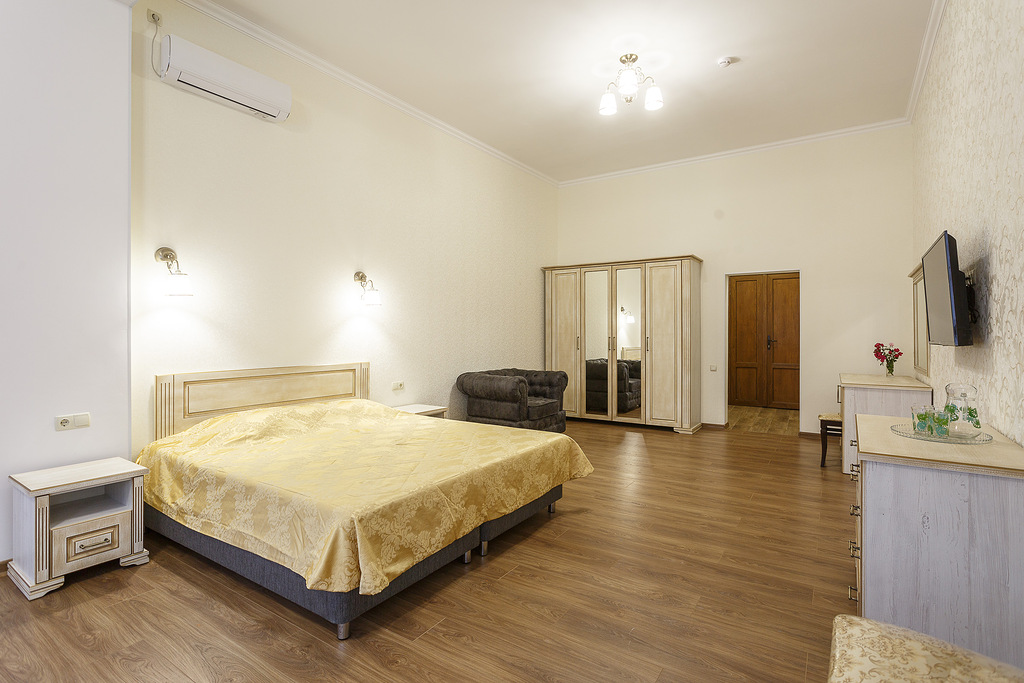 Площадь номера - 39,9 кв.м. 2 осн. места. 1 доп. место. Мебель: вешалка, зеркало, кровать двуспальная, прикроватные тумбочки, стол, стулья, шкаф. Оборудование: кондиционер, набор посуды, телевизор, телефон, холодильник, электрочайник. Санузел: с душем, туалетные принадлежности, фен. Сервис: смена полотенец, смена постельного белья, уборка номера, услуги внутренней телефонной связи.