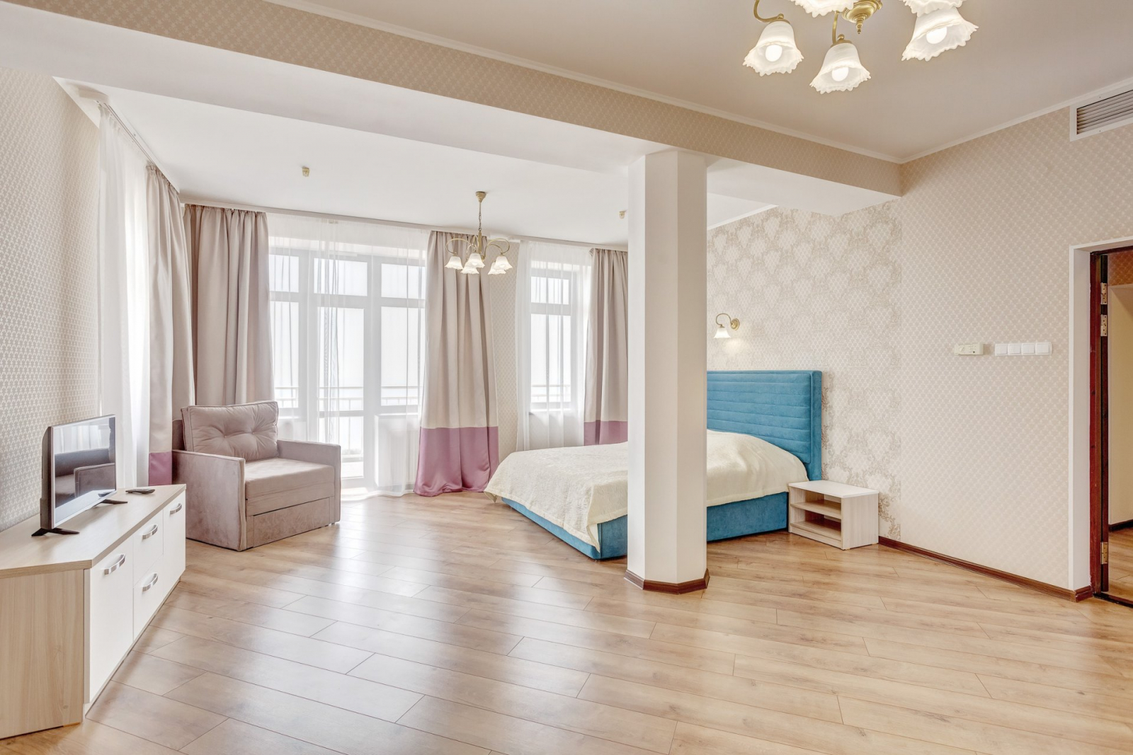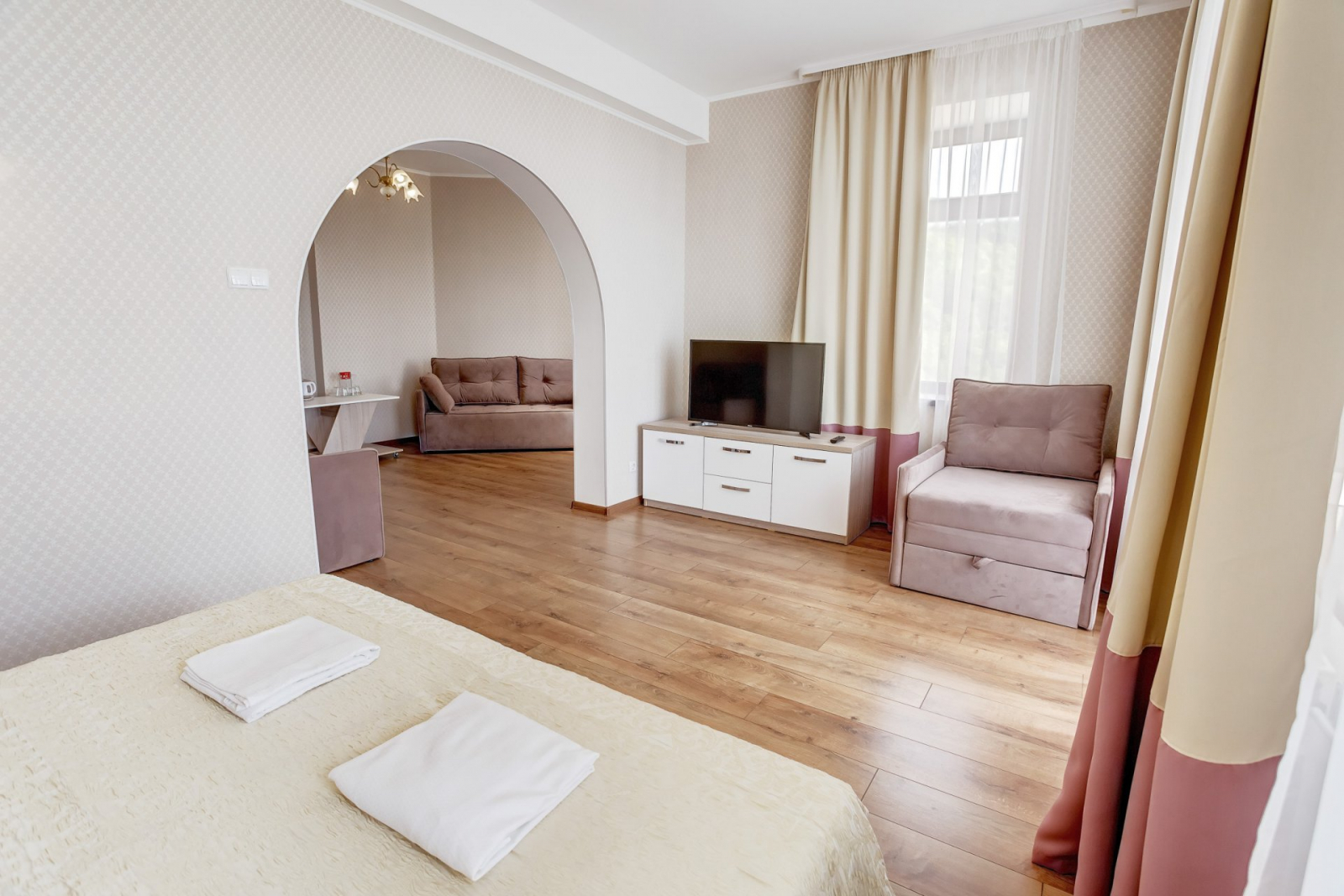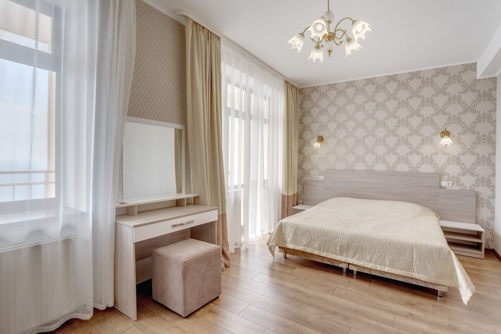 2 осн. места. 2 доп. места. Мебель: вешалка, диван, зеркало, кресла, кровати односпальные /одна двуспальная кровать, прикроватные тумбочки, стол, стул, тумба, шкаф. Оборудование: кондиционер, мини-холодильник, телевизор, электрочайник. Санузел: с ванной, туалетные принадлежности, фен. Сервис: Wi-Fi бесплатно, смена полотенец, смена постельного белья, уборка номера.