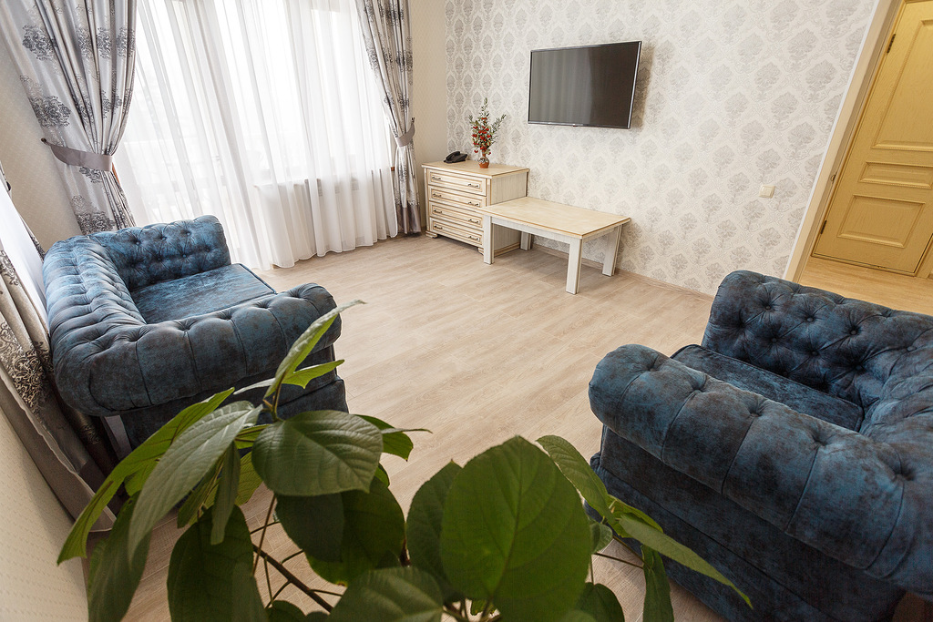 2 осн. места. 2 доп. места. Балкон. Мебель: вешалка, диван, зеркало, кресло, кровать двуспальная, прикроватные тумбочки, стол, стулья, шкаф. Оборудование: гладильная доска, кондиционер, набор посуды, телевизор, телефон, утюг, холодильник, электрочайник. Санузел: биде, с душем, туалетные принадлежности, фен. Сервис: смена полотенец, смена постельного белья, уборка номера, услуги внутренней телефонной связи.