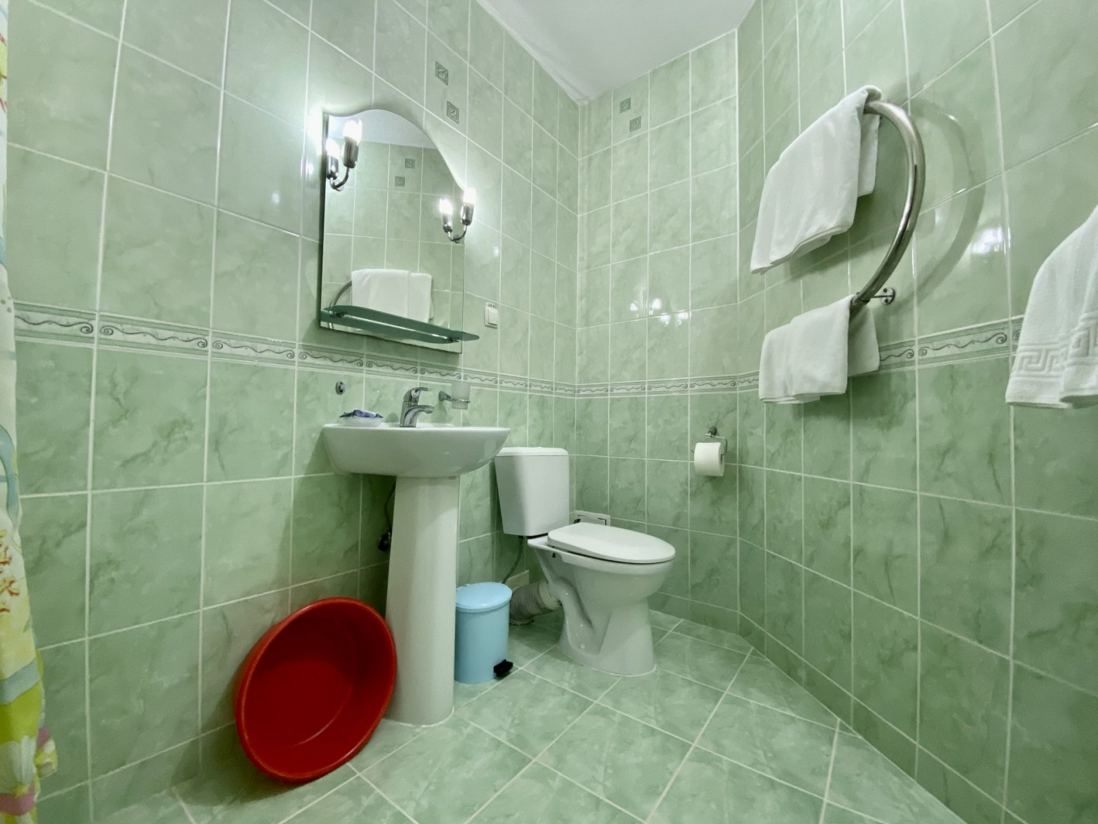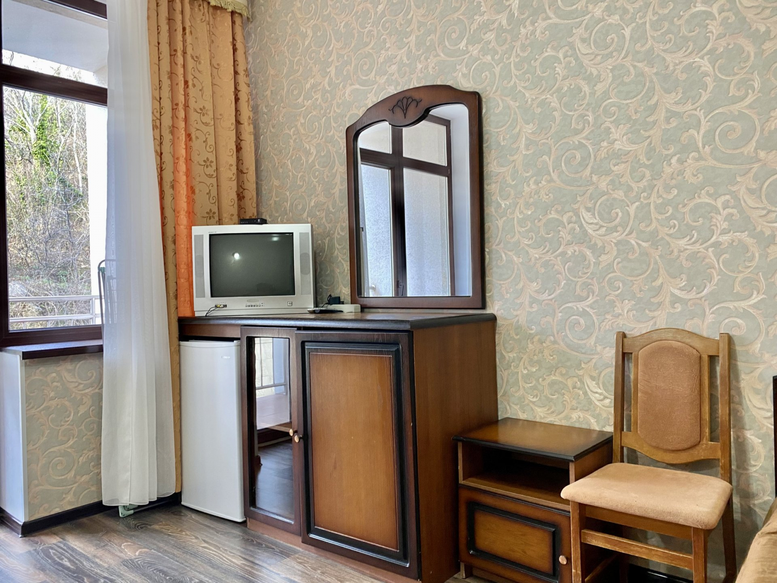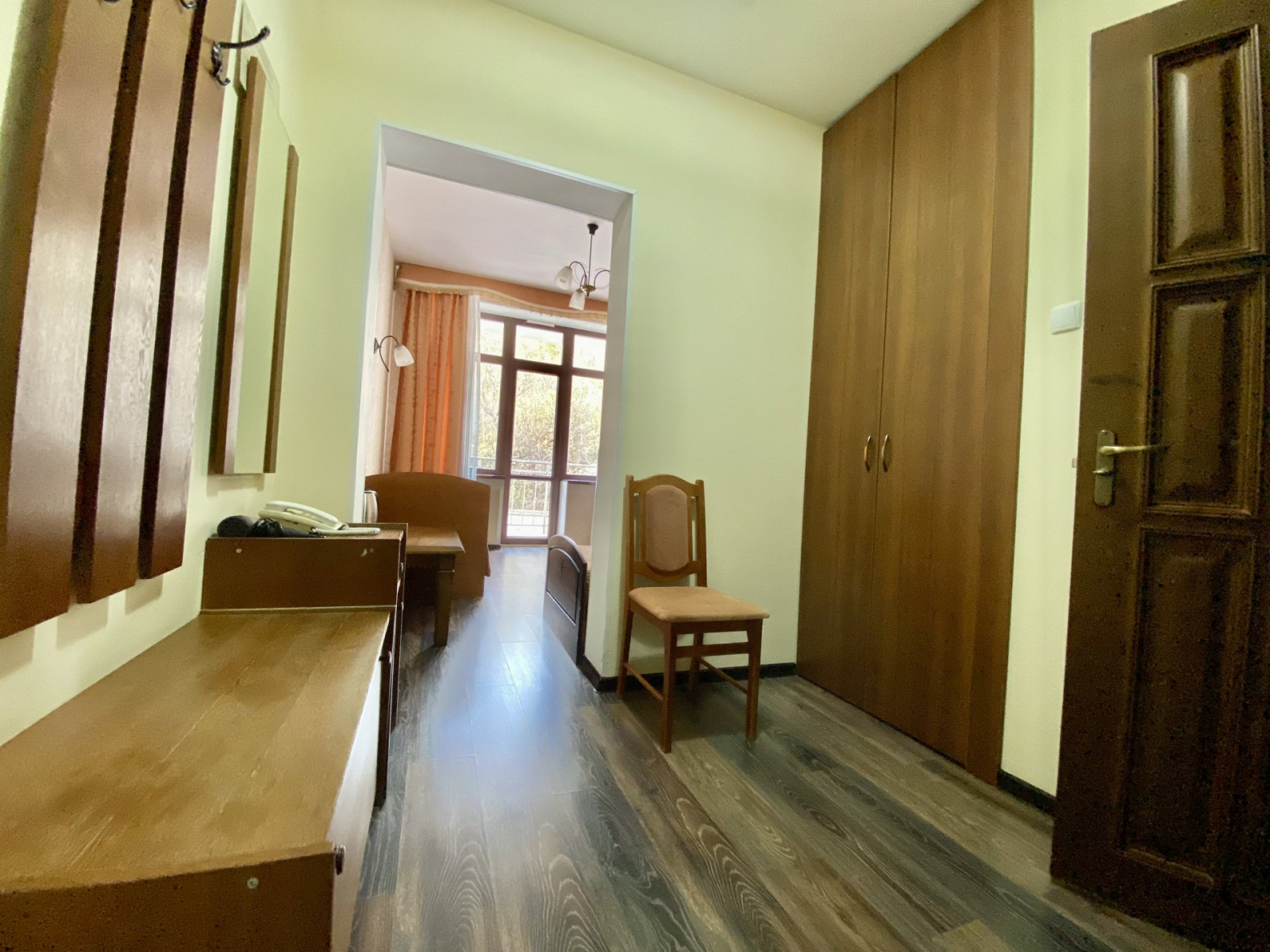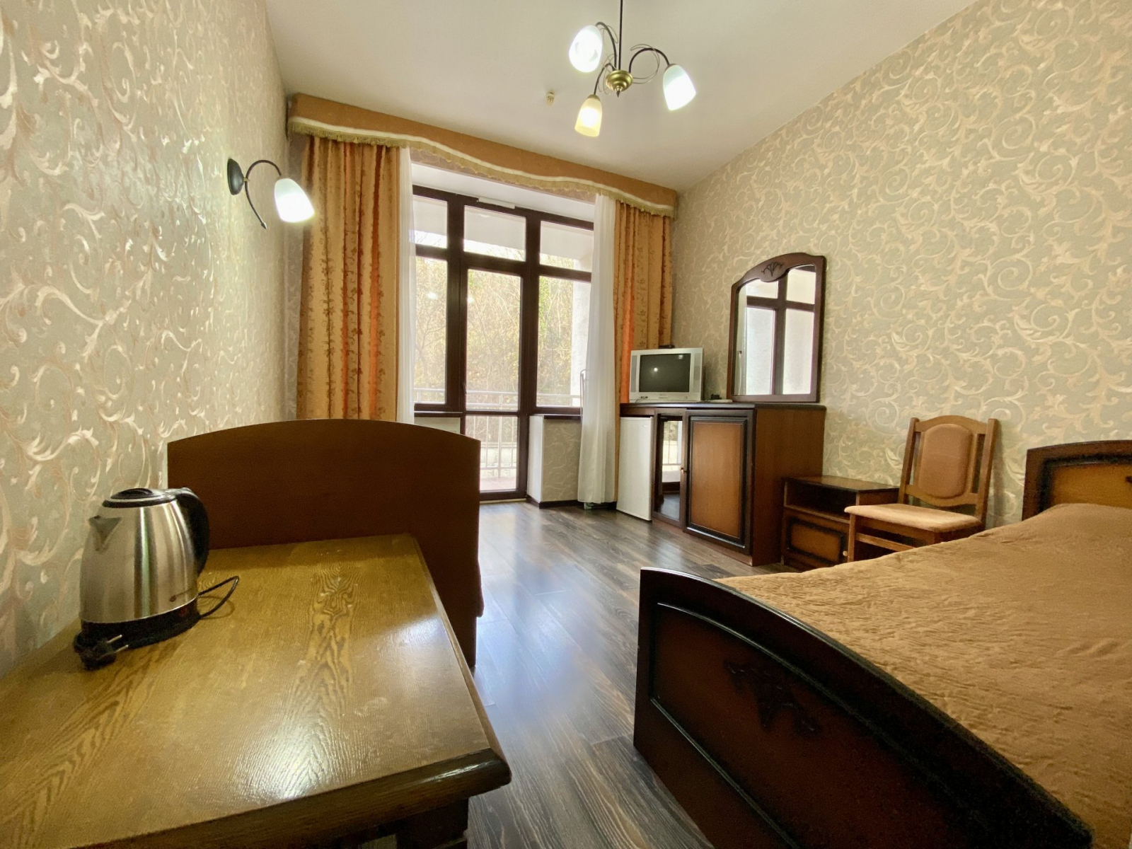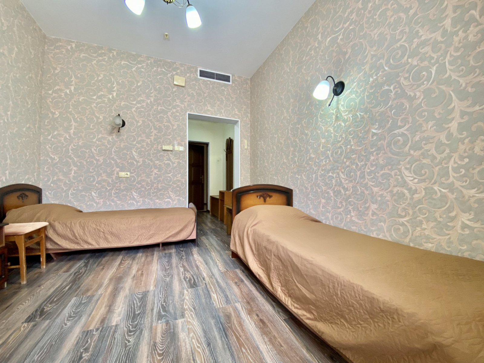Площадь номера - 14-16 кв.м. 2 осн. места. 1 доп. место. Балкон. Мебель: вешалка, зеркало, кровати односпальные, прикроватные тумбочки, стол, стулья. Оборудование: кондиционер, телевизор, холодильник. Санузел: с душем, туалетные принадлежности, фен. Сервис: Wi-Fi бесплатно, смена полотенец, смена постельного белья, уборка номера.