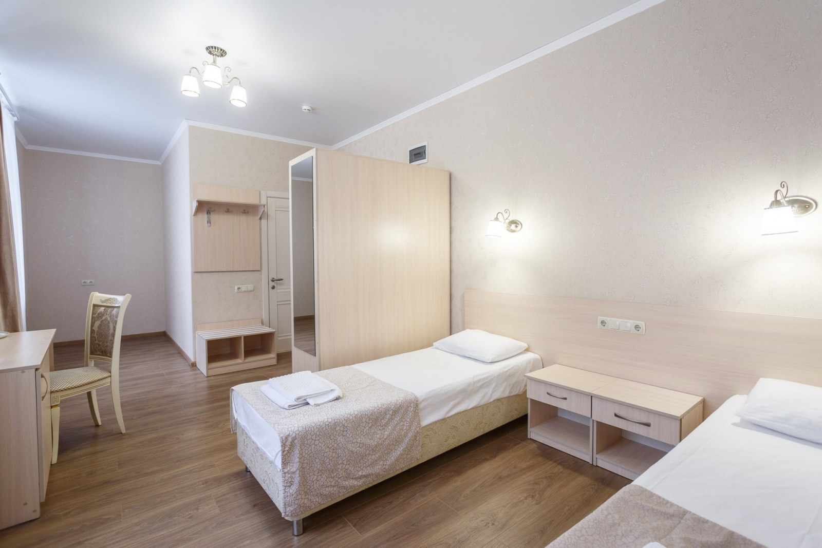 2 осн. места. 1 доп. место. Мебель: вешалка, зеркало, кресло, кровати односпальные /одна двуспальная кровать, прикроватные тумбочки, стол, стулья, шкаф. Оборудование: кондиционер, набор посуды, телевизор, телефон, холодильник, электрочайник. Санузел: с душем, туалетные принадлежности, фен. Сервис: смена полотенец, смена постельного белья, уборка номера, услуги внутренней телефонной связи.