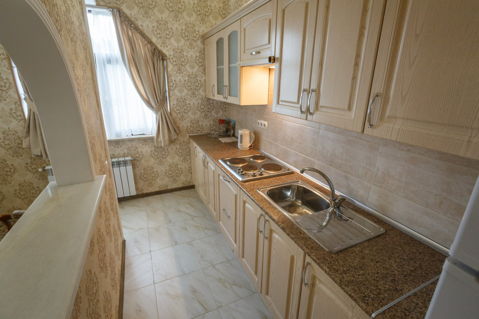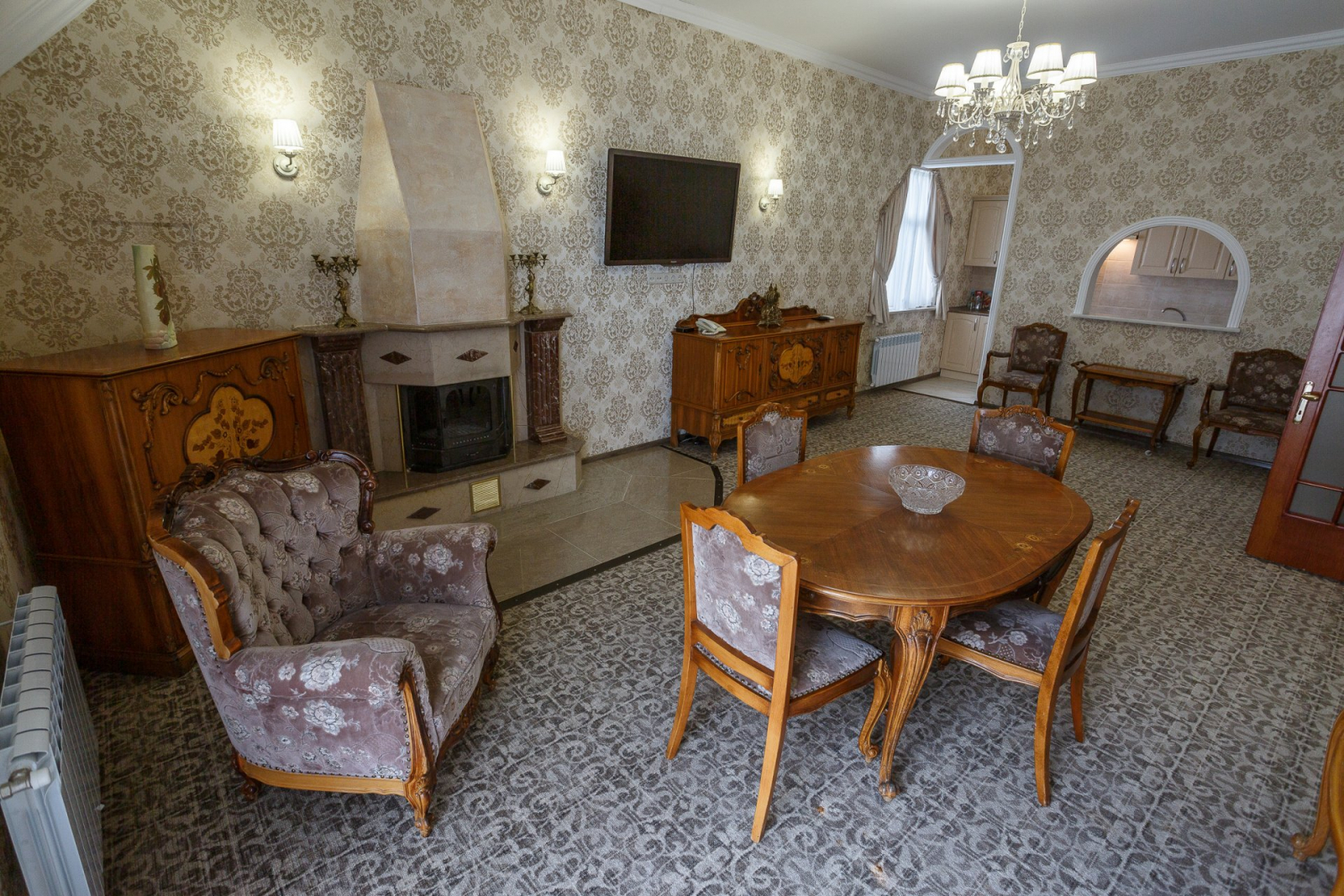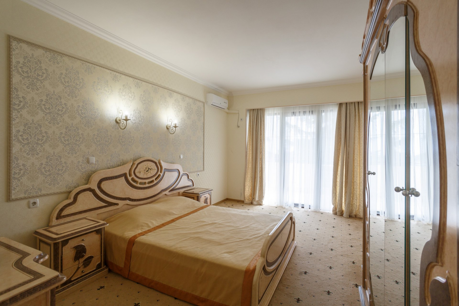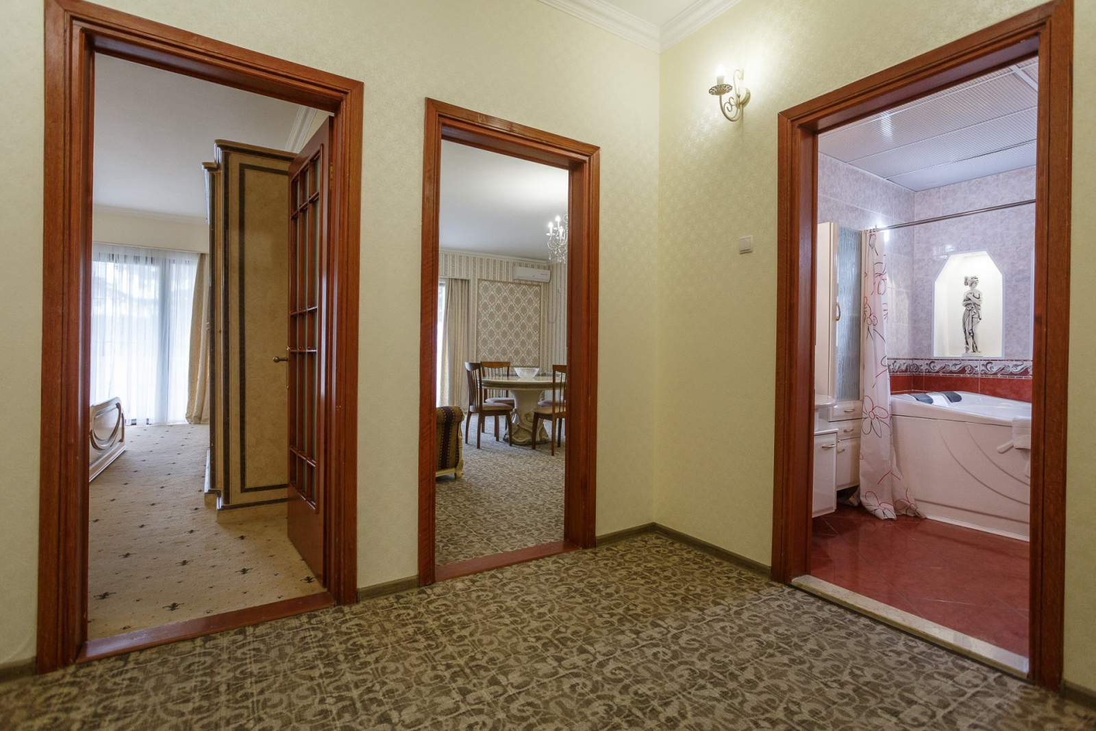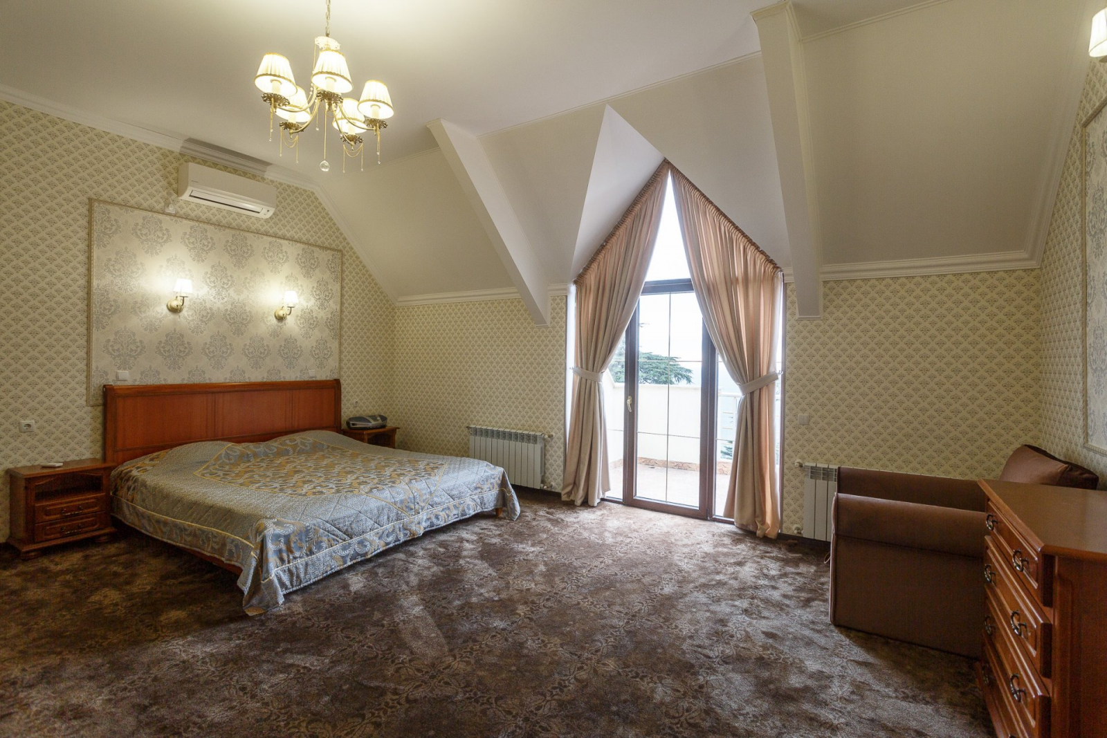 2 осн. места. 3 доп. места. Балкон. Мебель: вешалка, зеркало, кровать двуспальная, прикроватные тумбочки, стол, стулья, шкаф. Оборудование: кондиционер, набор посуды, телевизор, телефон, холодильник, электрочайник. Санузел: 2 санузла, с ванной/душем, туалетные принадлежности, фен. Сервис: смена полотенец, смена постельного белья, уборка номера, услуги внутренней телефонной связи.